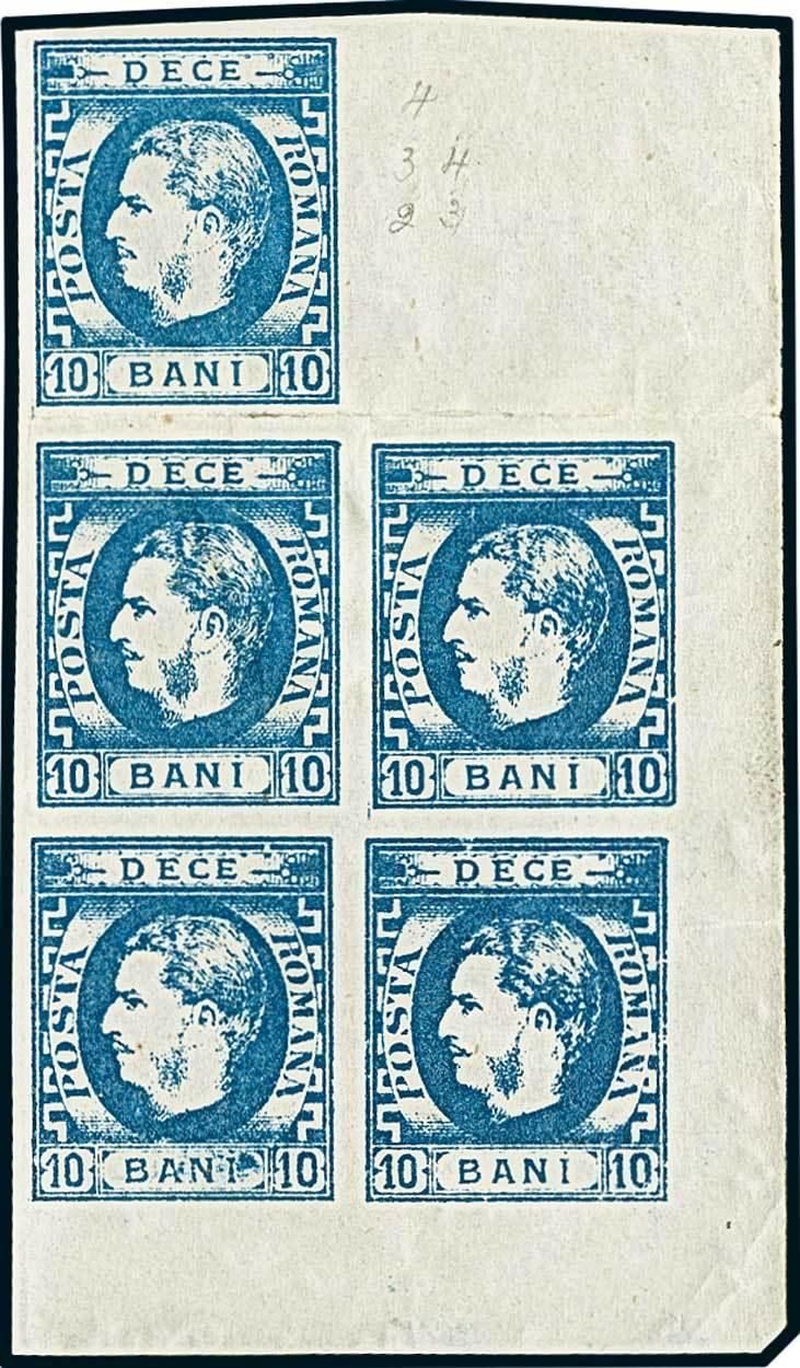 Rumania1869, 10 bani blue, a fresh vertical block of six from the bottom right corner of the sheet, positions 74/89-90/104-105, excellent balanced margins, showing blank space at top right, being one of only five blank spaces arranged vertically and consecutively in the sheet of 105, with original gum. A significant and rare marginal multiple to attempt a reconstruction of the plate, as no complete sheets are recorded. Signed Heimbüchler. Mi. 22a. Photo
