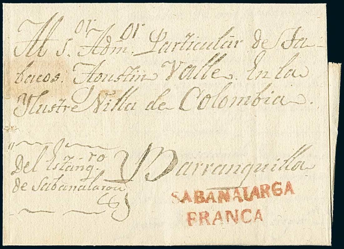ColombiaStampless MailIndependent Republic Period1822, June 4. Entire letter to Barranquilla endorsed "Del Estanquero de Sabanalarga", struck with superb "Sabanalarga" & "Franca" straight-line handstamps in red. The only reported example. Ex Bortfeldt. Photo