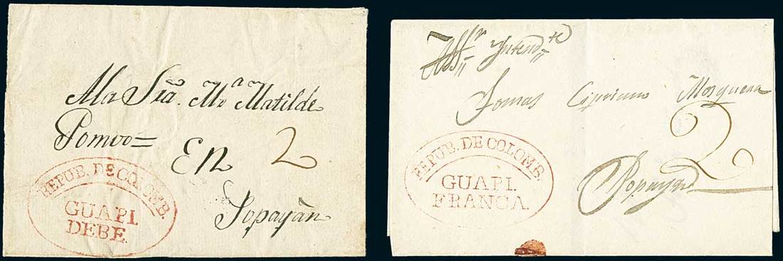 ColombiaStampless MailIndependent Republic Period1827-28. Two covers rated at 2 reales and addressed to Popayán, one sent paid showing "Repub. De Colomb./Guapi./Franca." large oval, the other unpaid with similar handstamp but with "Debe.", both postmarks being neatly applied in red. Ex Santa María and Goeggel. Photo