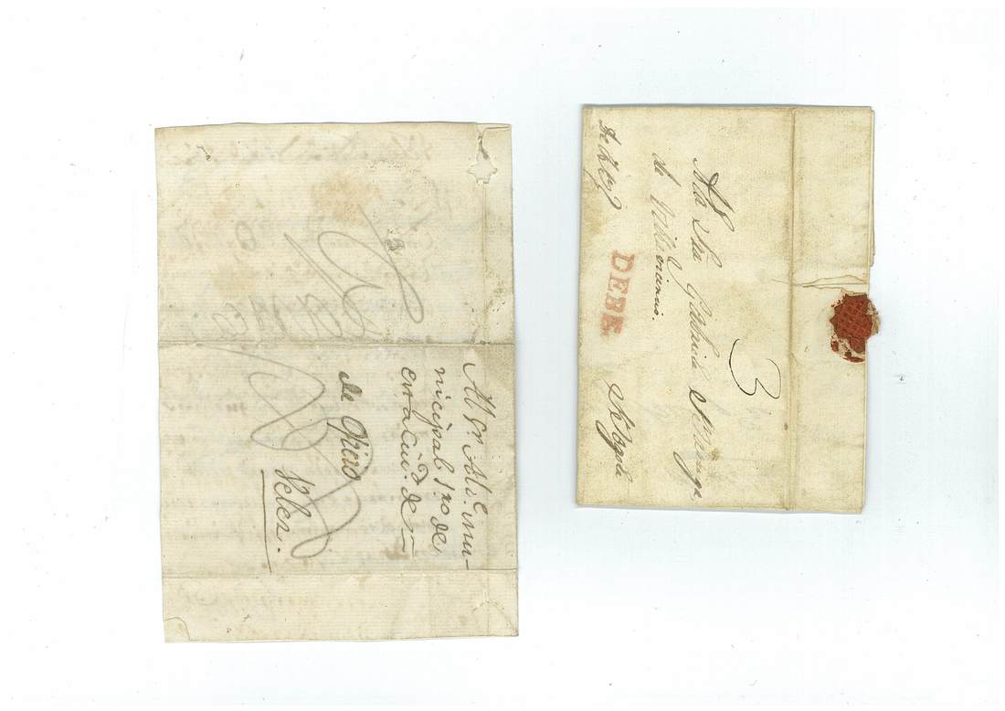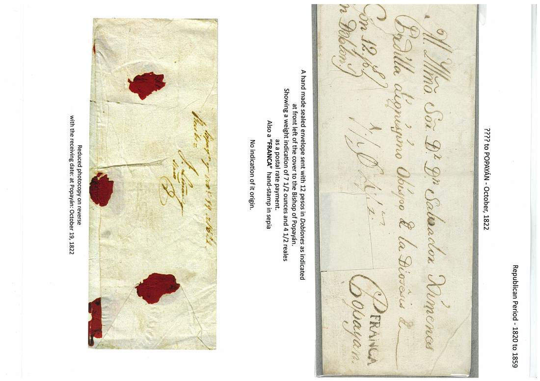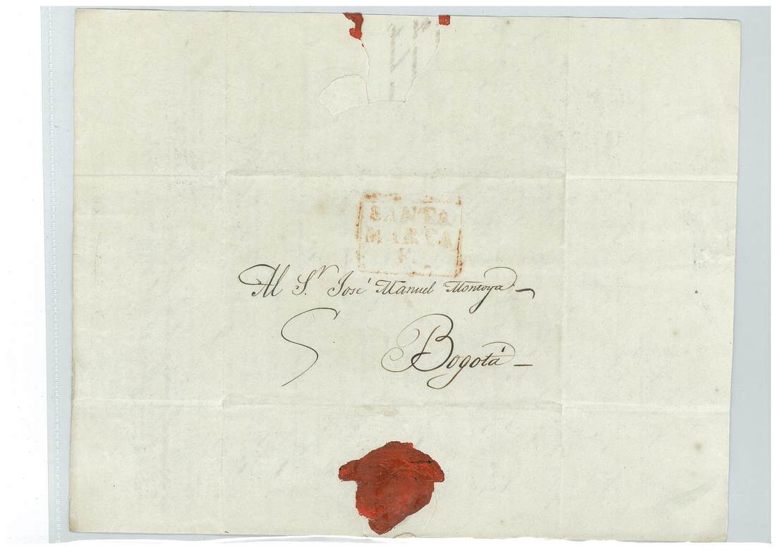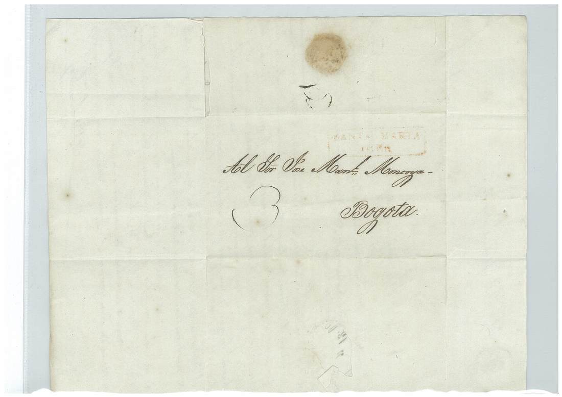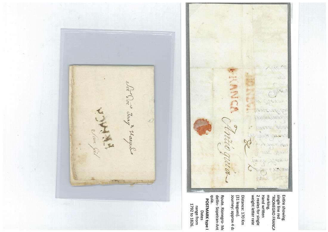 ColombiaStampless MailIndependent Republic Period1822-29. Seven covers/entire letters with postmarks including "Franca" straight-line (2, one on very rare entire originating from Pinchote), "Rio Negro" & "Franca" in red, (the previous examples being of Spanish origin); italic "Debe", red framed "San Marta/Debe" and "Santa/Marta/F", and manuscript "de Oficio". Two items with paper loss on front.