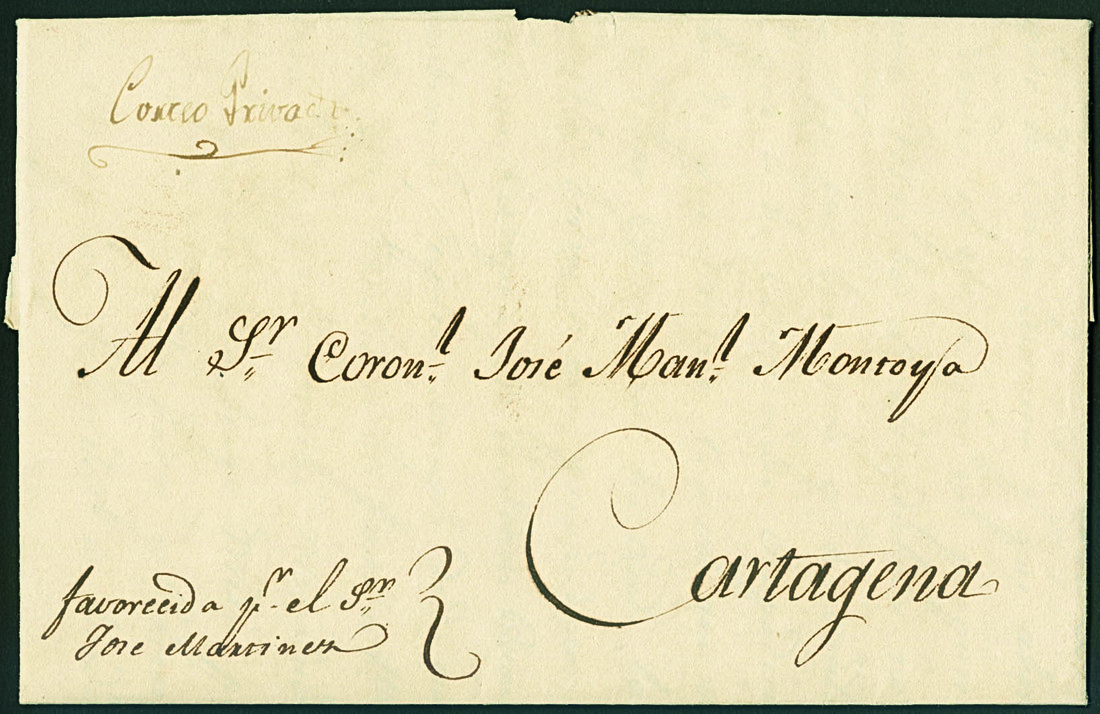 ColombiaStampless MailIndependent Republic Period1831, Jan. 24. Entire letter with a further letter inside, from Santa Marta to Cartagena, endorsed "Correo Privado" and "favorecida por el Sr. José Martínez". The contents, being a duplicate, complain about not having had answers to previous letters, this being probably the reason for which the sender used private mail to consign his correspondence to the addressee (this practice was strictly forbidden during the Spanish rule). To our knowledge, this is the only cover known with the "Correo Privado" (private mail) endorsement. Ex Santa María.