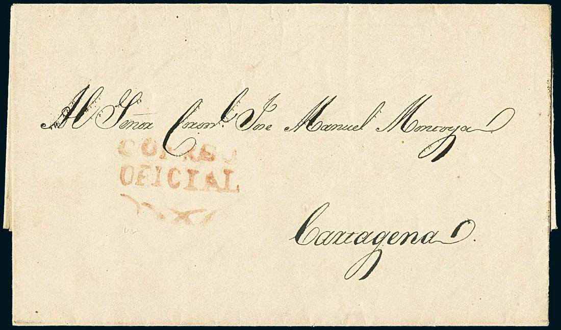 ColombiaStampless MailIndependent Republic Period1831. Two entire letters from Santa Marta addressed to Colonel José manuel Montoya, one with "Correo/Oficial two-line fancy handstamp, the other with framed "Servicio Oficial", both in red. Four and three items so far known of each postmark. Photo