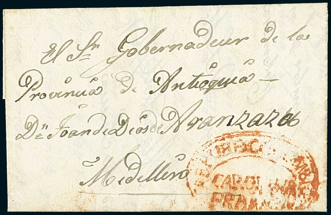 ColombiaStampless MailIndependent Republic Period1834, July 11. Entire letter addressed to Juan De Dios Aránzazu at Medellín, then Governor of Antioquia (he will become the first President of the Republic originating from this province), sent by a Swedish citizen claiming for justice, bearing large "Repu De Colombia/Carolina/Franca" oval handstamp in red. About five covers with this postmark so far recorded. Photo
