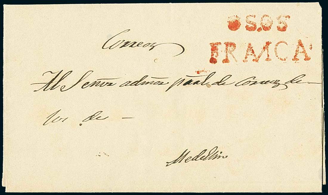 ColombiaStampless MailIndependent Republic Period1841, Sept. 12. Entire letter sent by the Postmaster of Santa Rosa to the Postamaster of Medellín, bearing "Osos" & "Franca" straight-line handstamps in red from the colonial period. To our knwledge, less than five items known after the Independence. Photo