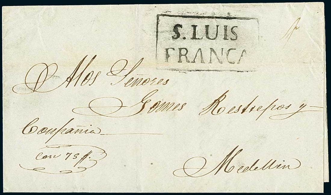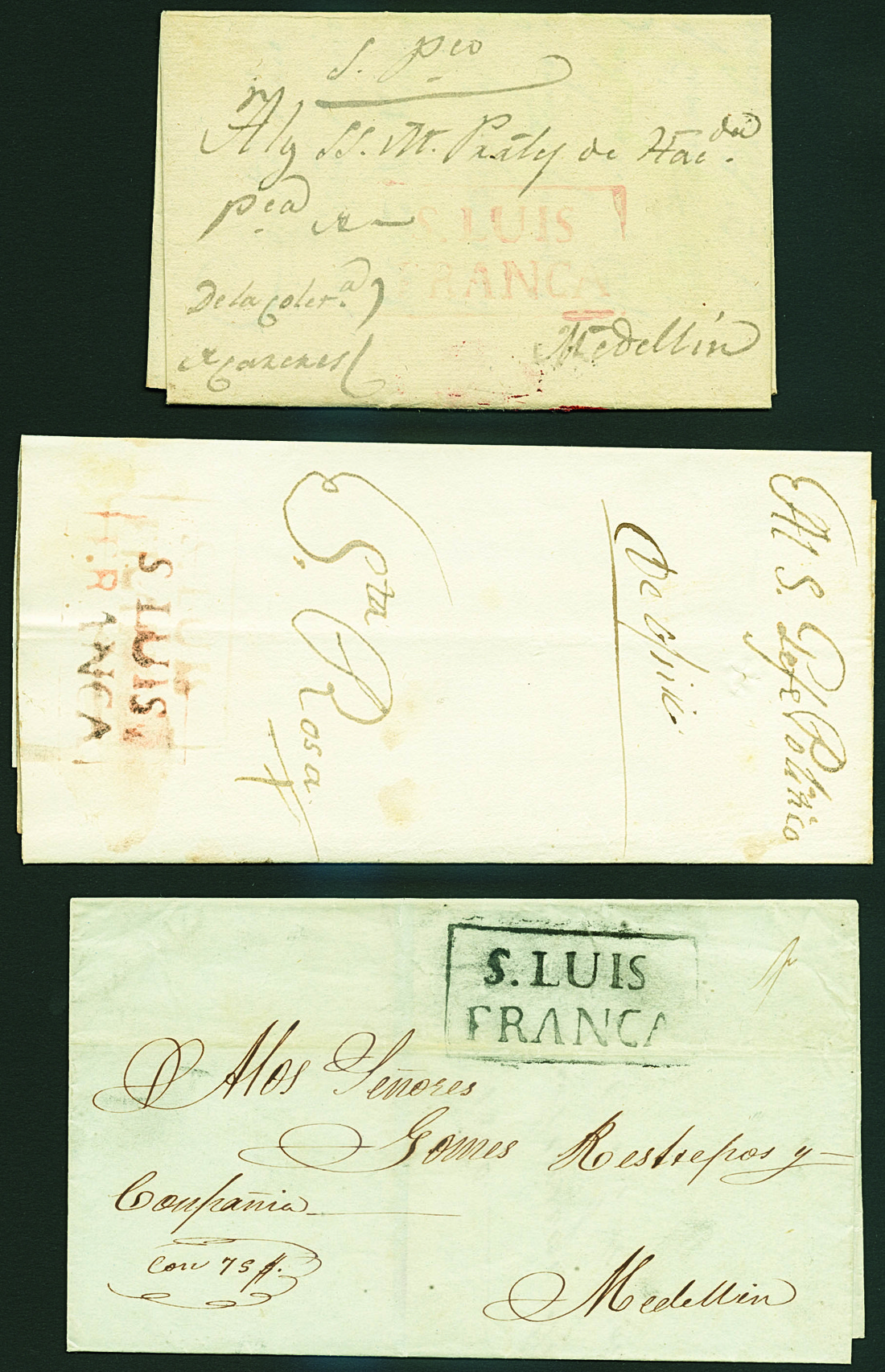 ColombiaStampless MailIndependent Republic Period1833-50. Three covers from San Luis de Góngora (from 1838 named Yarumal) showing the framed "S. Luis/Franca" handstamp, one endorsed "De Oficio" and sent to Santa Rosa with two strikes of this postmark in red, the second to Medellín with a faint strike in red, the third to the same destination bearing one neat strike in black (extremely rare in this colour). Only about five items so far known. Ex Bortfeldt. Photo