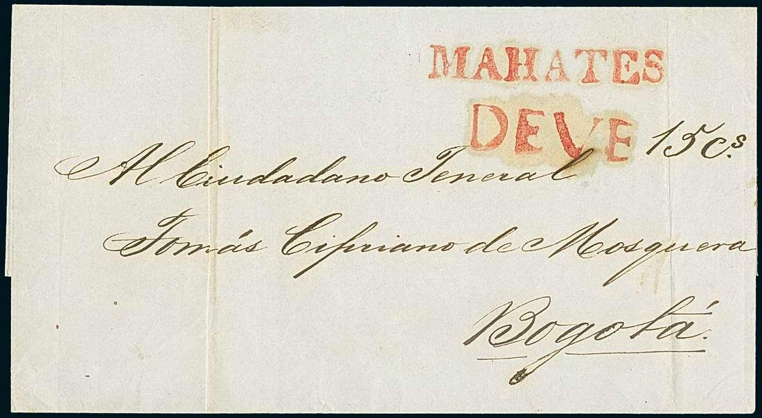 ColombiaStampless MailIndependent Republic Period1855, Jan. 14. Cover addressed to General Mosquera at Bogotá, rated "15 Cs.", showing "Mahates" & "Deve" straight-line handstamps in red. Superb, one of just four items known. Ex Santa María. Photo