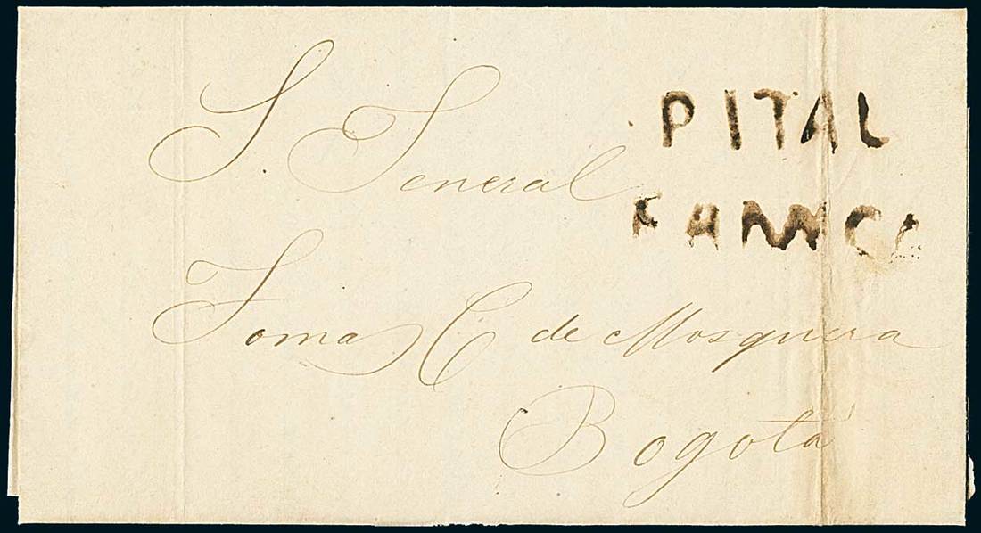 ColombiaStampless MailIndependent Republic Period1856, April 30. Entire letter from Pital addressed to General Mosquera at Bogotá, struck by "Pital" & "Franca" straight-line handstamps. One of only two items recorded with this Pital postmark, very desirable. Photo