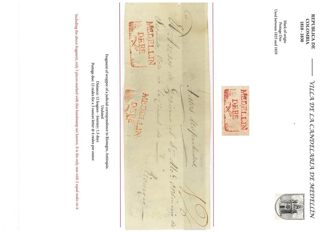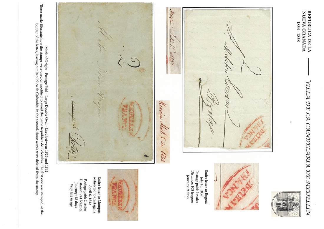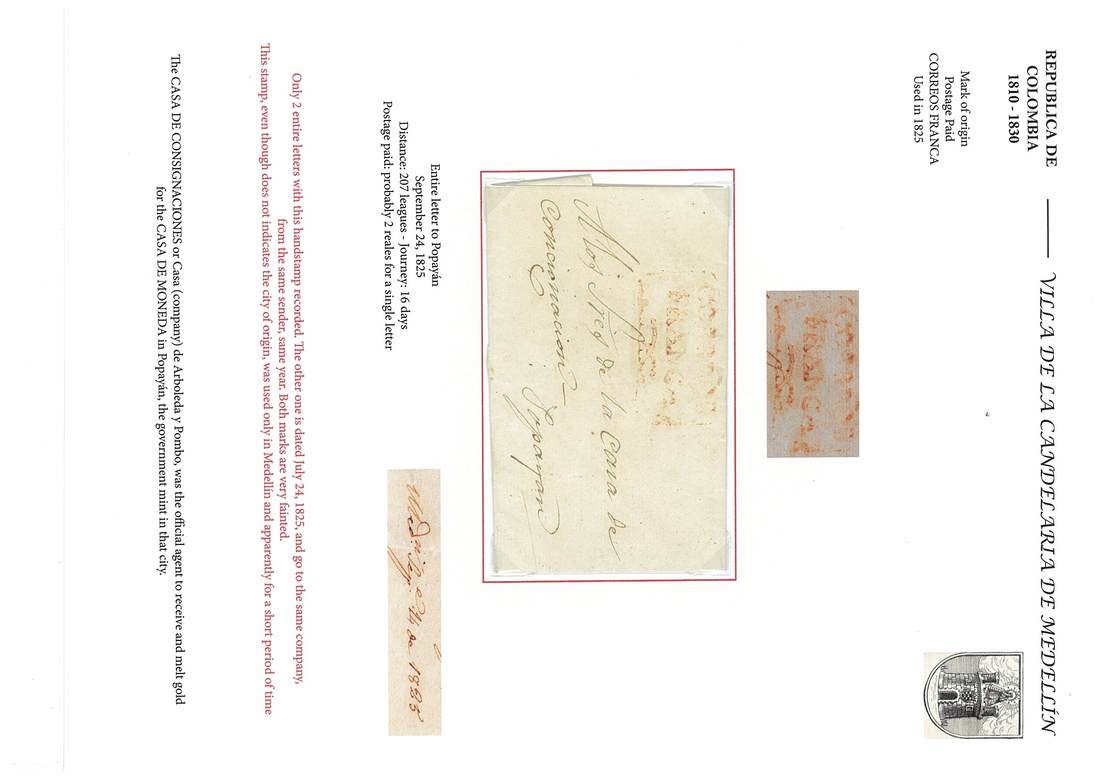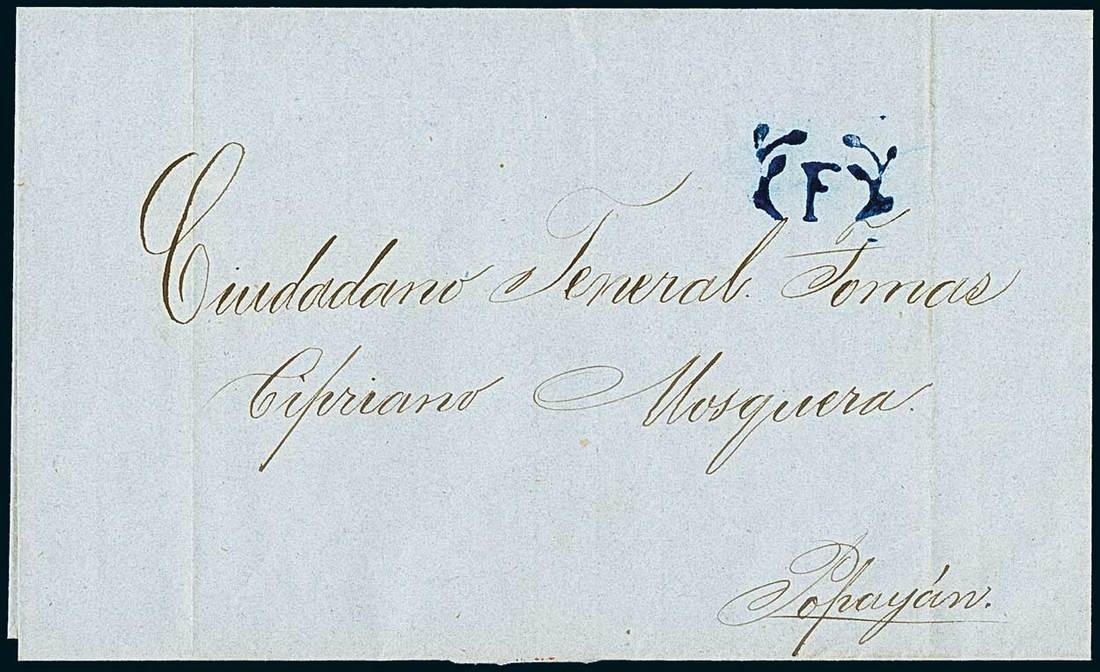 ColombiaStampless MailIndependent Republic Period1857, Dec. 19. Official cover to General Mosquera at Popayán, with "F" fancy handstamp with laurels (a very late usage for a postmark originating from the colonial period), and used at Iscuandé, being extremely rare applied in blue. Ex Santa María and Bortfeldt. Photo