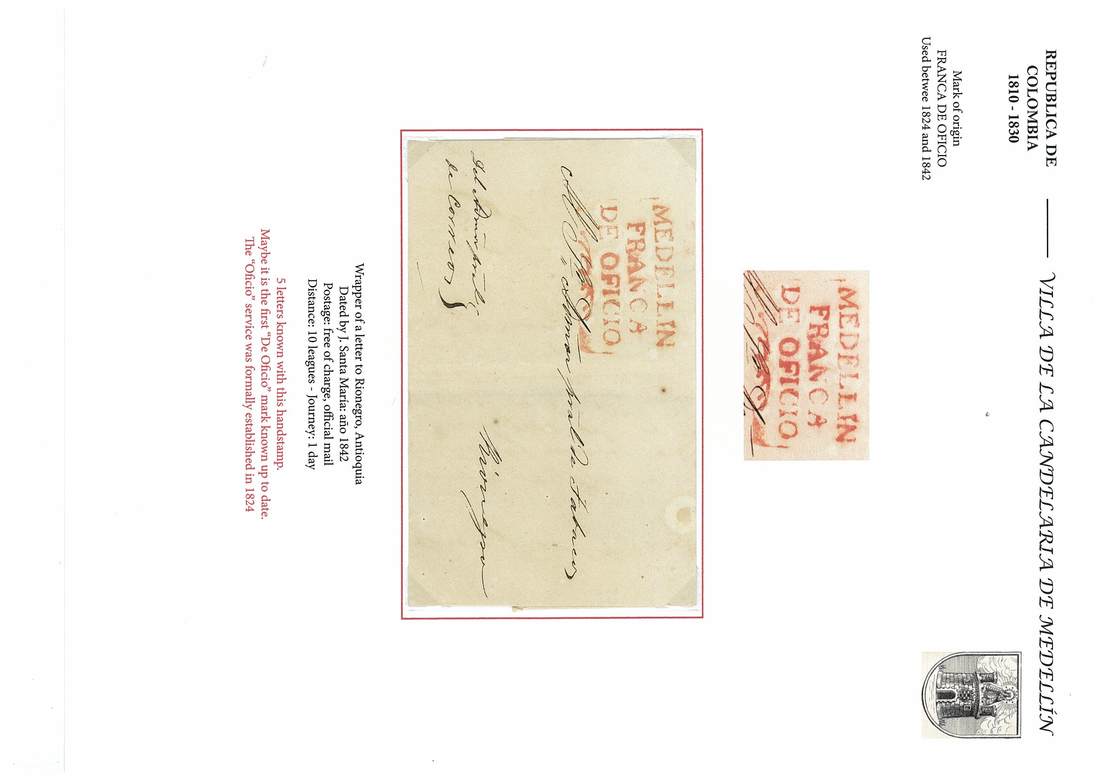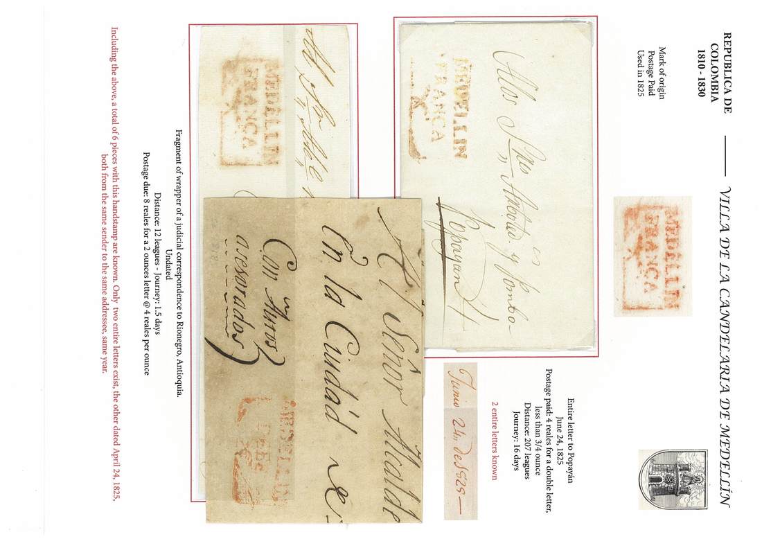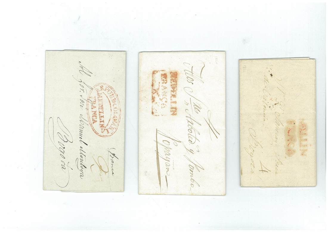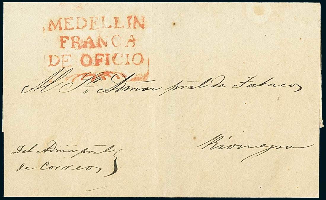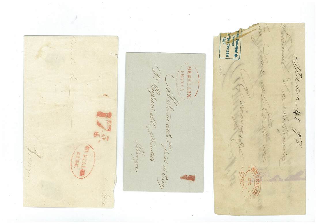 ColombiaStampless MailIndependent Republic Period1822-58. A comprehensive assembly comprising 18 covers and one document with listing of mail sent, bearing 11 different postmarks including framed "Medellin/Franca/De Oficio", abbreviated "Medllin/Franca" from the colonial period (this being exceedingly rare without frame), framed "Correos/Franca", "Medellin/franca" & "Medellin/Debe", large and small ovals. Fine to very fine. Photo