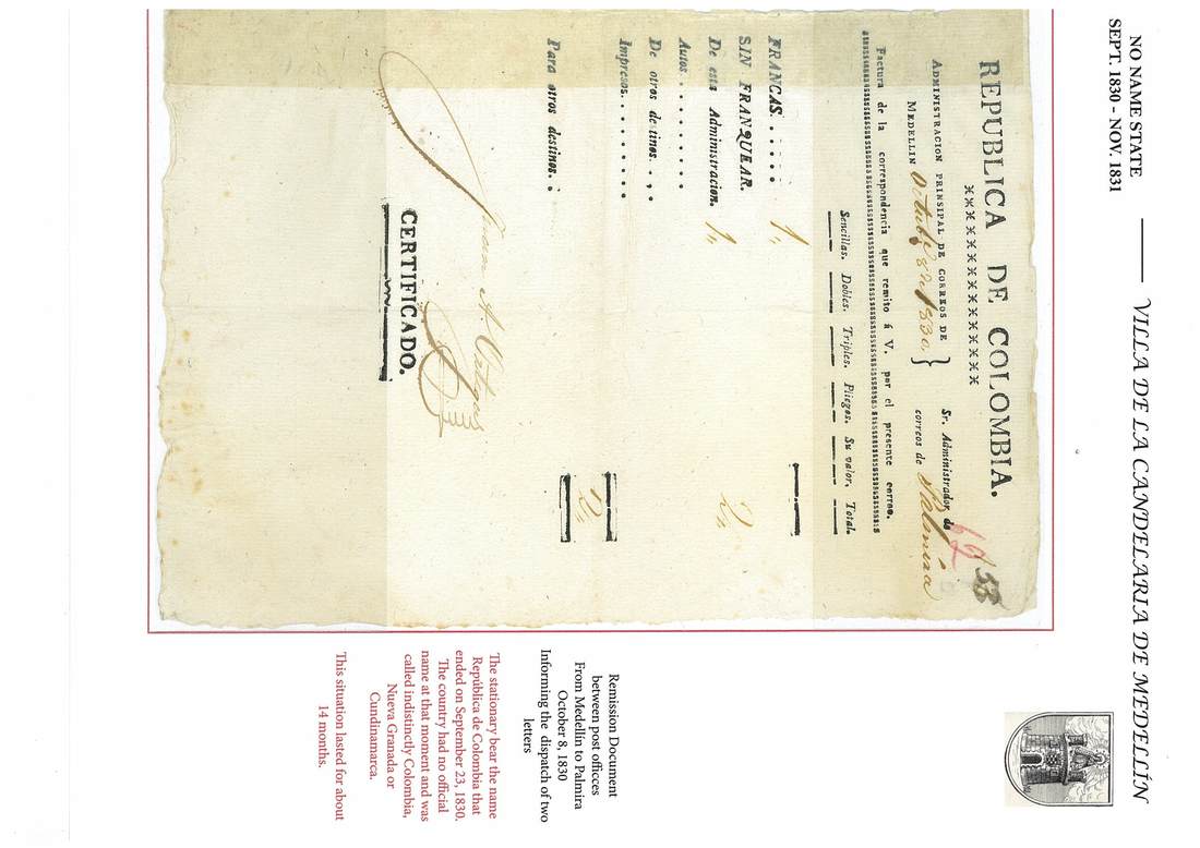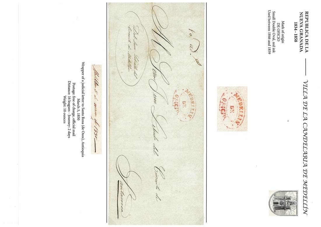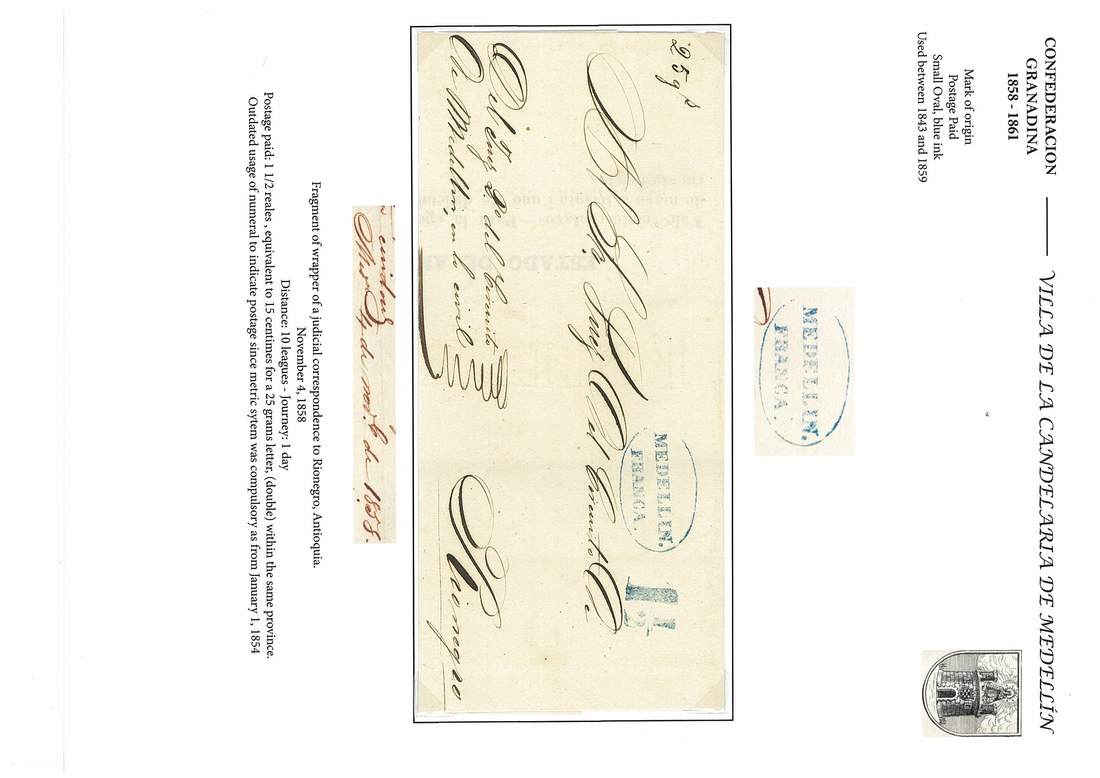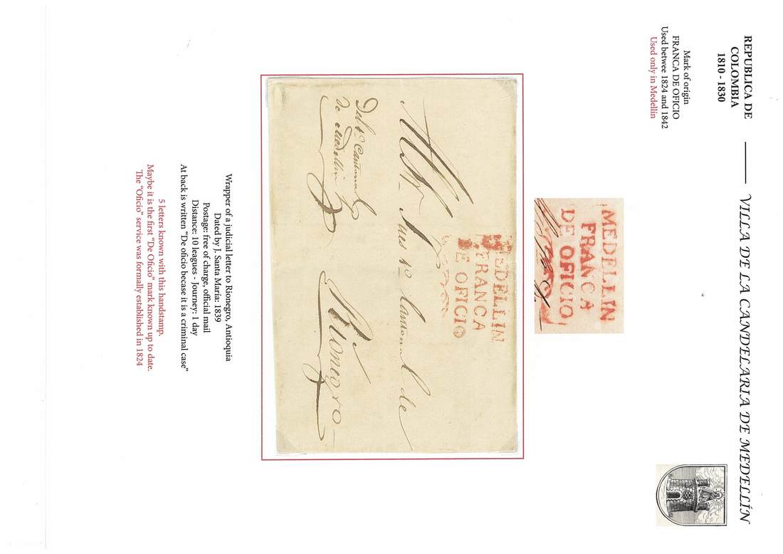 ColombiaStampless MailIndependent Republic Period1822-58. A comprehensive assembly comprising 18 covers and one document with listing of mail sent, bearing 11 different postmarks including framed "Medellin/Franca/De Oficio", abbreviated "Medllin/Franca" from the colonial period (this being exceedingly rare without frame), framed "Correos/Franca", "Medellin/franca" & "Medellin/Debe", large and small ovals. Fine to very fine. Photo