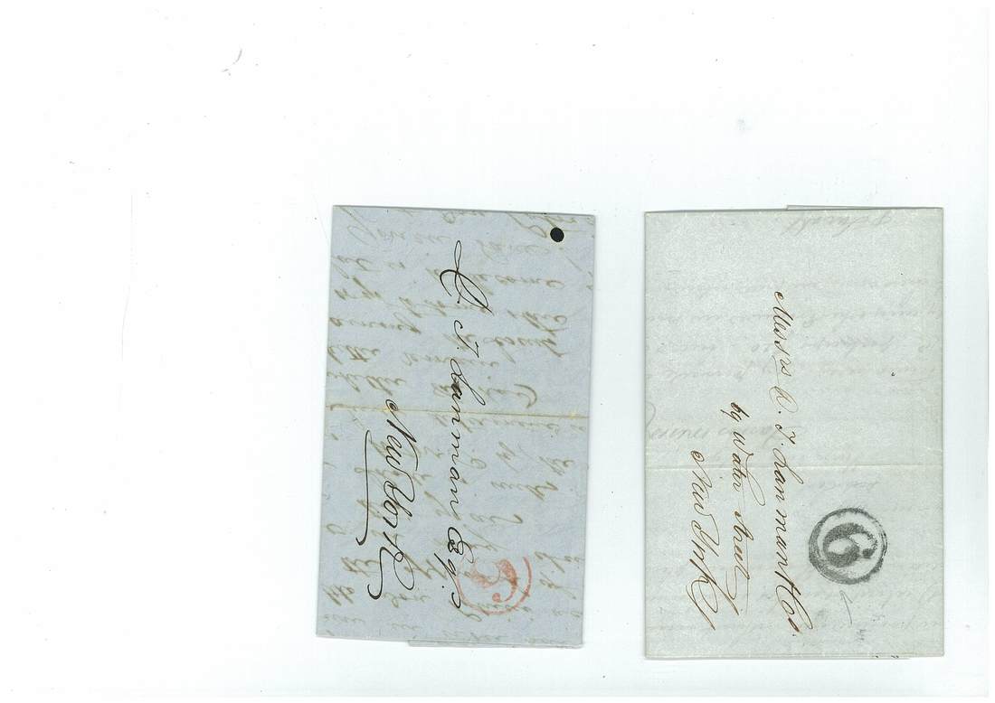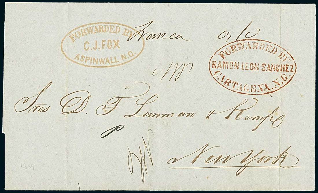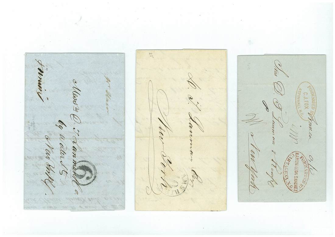 ColombiaStampless MailIndependent Republic Period1836-59. Five entire letters from Barranquilla to New York, of which three bearing "6" steamship due marking (one in red), "10 Steamship" in circle" and the fifth Ramón León Sánchez (Cartagena) and C.J. Fox (Aspinwal) forwarding agent markings. An unusual group. Photo