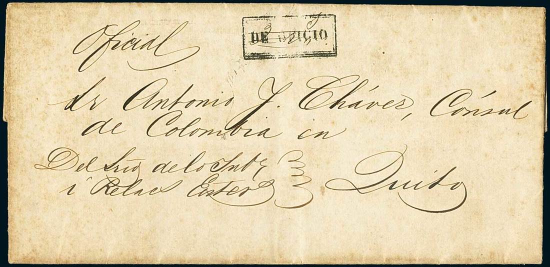 ColombiaStampless MailIndependent Republic Period1867, May 25. Printed circular sent by the Ministry of Internal and Foreign Affairs to the Colombian Consul in Quito (Ecuador), signed by the Secretary of the Ministry Carlos Martín, with contents stating the turbulent events which had recently taken place : on 29 April the elected President General Mosquera had closed the Congress and proclaimed the dictatorship; on 23 May he had been captured by the Commander of the Army General Santos Acosta, who was then designated President on that day, acting as guarantor of the Congress. Front struck with framed "De Oficio" handstamp which was crossed out and amended with "2 rs." (reales) in manuscript. To be noted in the text that "these events have saved the Republic" (not using the correct term "Nation" instead of "Republic"). A fascinating and historic document carried through the mails to a foreign destination. Photo