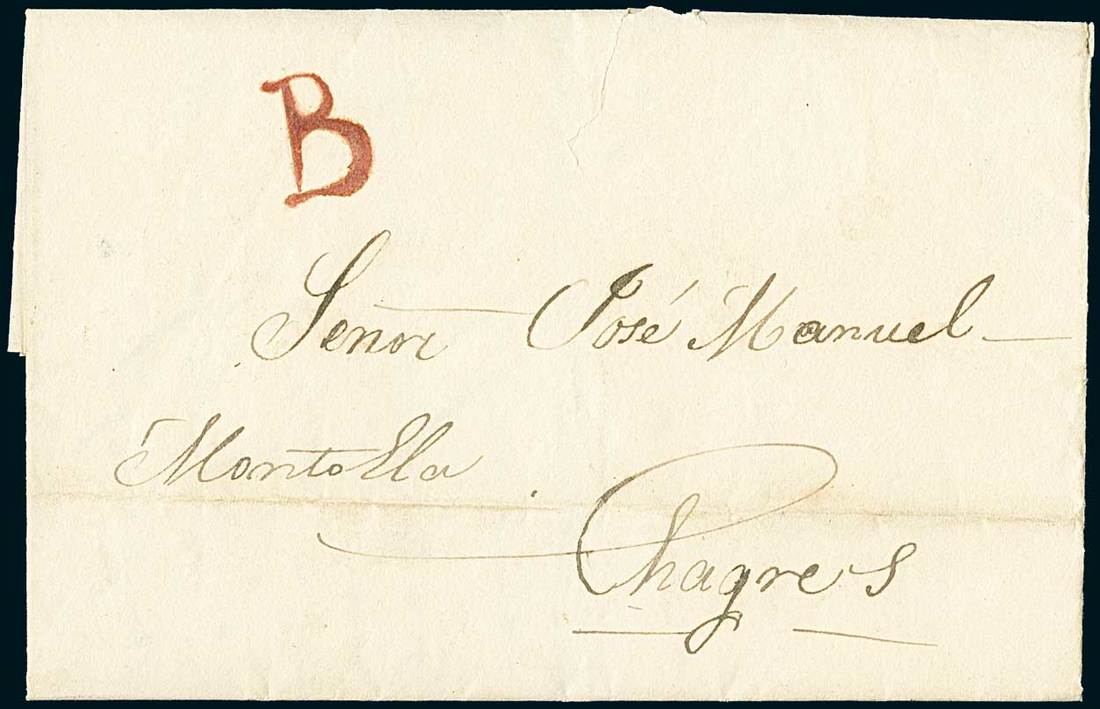 ColombiaStampless MailPanama1825, July 19. Entire letter from Panama to Chagres, showing red "B" of unknown origin, in a similar shape of the "B" in the "SB" colonial handstamp used at San Bartolomé. To our knowledge, the only example known of this mysterious and fascinating marking. Also a 1826 entire letter from Panama to Guayaquil without any postal marking and only showing "L" in manuscript (this would not be any of the initials of both sender and addressee). Photo