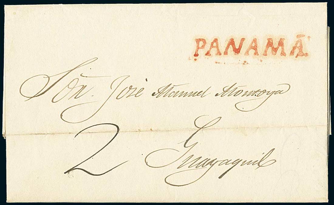 ColombiaStampless MailPanama1826, April 8. Entire letter to Guayaquil (nowadays in Ecuador), showing neat slanted "Panamá." straight-line handstamp of Spanish origin, carried at "2" reales single rate. Scarce and superb. Ex Bortfeldt. Photo