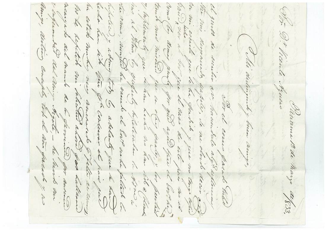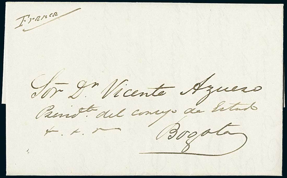 ColombiaStampless MailPanama1812-1833. Three items, of which two official letters (1812-13) from Panama and Portobelo with interesting contents: "a este esfuerzo me ha movido el ofrecimiento de otro capitán de armarse de corsario y pasar a Santa Marta..." & "...nos ha faltado la carne y el pan, y si esto sigue así es preciso perezca por hambre y peste mucha gente", etc. The third is an entire letter (1833) from Panama addressed to the "Presidente del Consejo de Estado" at Bogotá, endorsed "Franca" in manuscript with contents: "...aquí siempre el gobierno ha tenido más miseria que en otras partes (...) aunque ha variado el gobierno no ha faltado la hipoteca (...) hay más de quince días que estoy supliendo las raciones diarias de la tropa". An interesting and unusual trio. Ex Bortfeldt. Photo