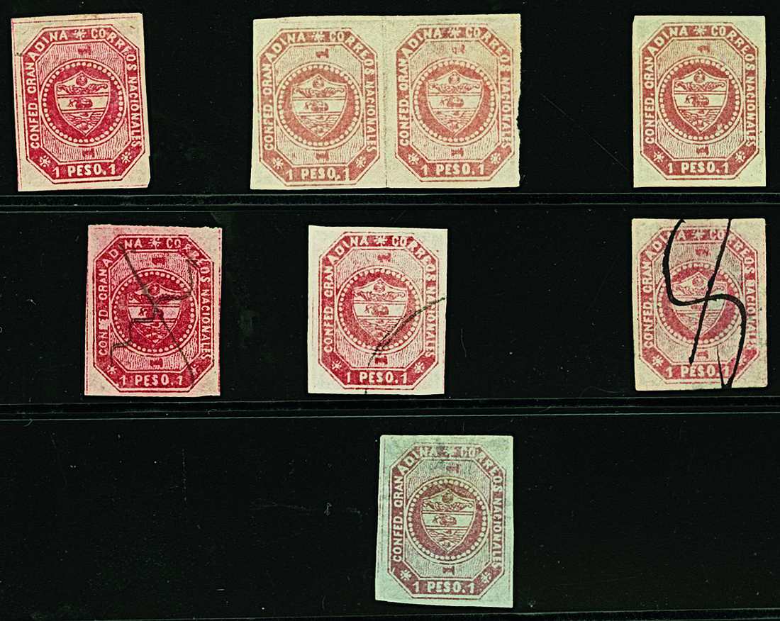 ColombiaClassic Period1859, 1p rose/carmine, eight stamps of which four unused with and without gum including one pair, three used with two showing pen strokes with one showing rare flaws consisting in white dash at top right through "RE" of "Correos" and colourless spot in "FE" of "Confed.", as well as scarce 1p. on blued paper. Three with minor usual imperfections, all large margined. Scott 7, 7a, 8.