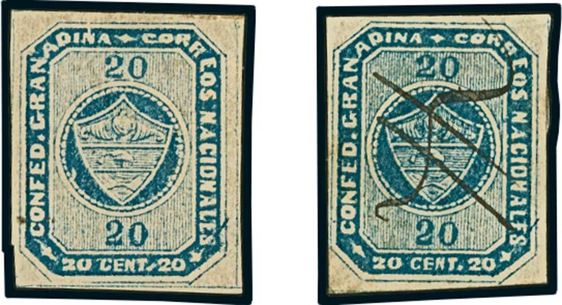 ColombiaClassic Period1860, 20c. blue, stone B, two large margined examples, one unused with part o.g., the other showing manuscript cancel featuring three pen strokes. This stone is rarely found in used condition. A fine duo. Scott 12. Photo