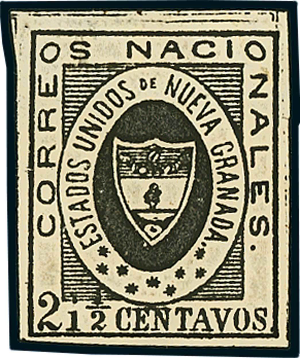 ColombiaClassic Period1861, 2½c. black, good to huge margins, strong colour, a mint example with original gum. Part of the gum missing at top where a hinge was stuck. A rare stamp with original gum. Cert. Sorani. Scott 13. Ex Sánchez Vega. Photo