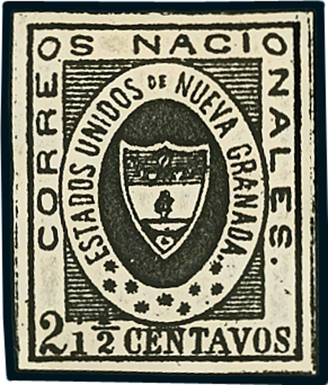 ColombiaClassic Period1861, 2½c. black, a magnificent mint example, with very good margins showing dividing lines between clichés on three sides, very fresh featuring strong colour, showing broken "S" of "Nacionales". A very fine representation of this stamp which is very scarce with original gum. Very fine. Scott 13. Ex Londoño. Photo
