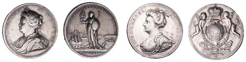 William and Mary, Coronation 1689, official silver medal by Roettiers, busts right, rev. Jove hurling thunderbolt at Phaeton, 35mm. (E.312; MI.662,25); Anne, silver medals (3), Battle of Blenheim 1704, Union with Scotland 1707, and Peace of Utrecht 1713 (E.409, 425, 460), fine and better (4) Estimate £ 100-120