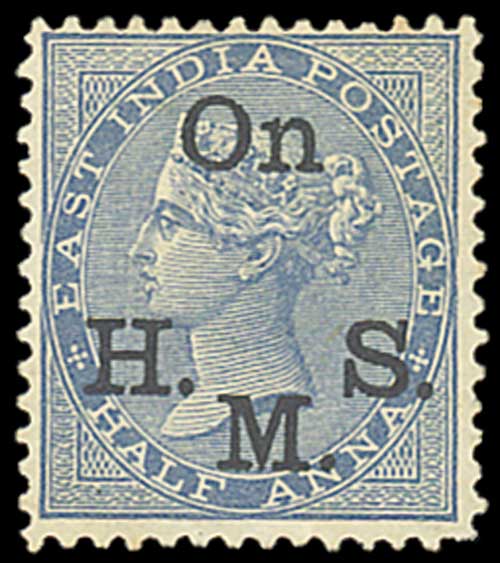 x India Official Stamps 1874-82 Issue 1/2a. blue Die II with overprint in blue-black, unused with part original gum; a few small faults though of fine appearance and far above average for this scarce stamp. S.G. O36, £475. Photo Estimate £ 150-180