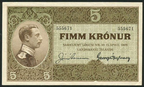 Bank of Iceland, 5 kronur, law of 1928 (1929), serial number 555671, pale and dark green, King Christian X at left, two signatures at right, reverse green-brown, falcon at centre, value top left and right(Pick 23), fresh and original, good extremely fine thus rare