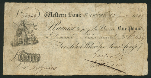 Western Bank Exeter (John Wilcocks Sons & Compy), £1, 10 January 1809, serial number C2439, black and white, Britannia standing at left, manuscript signature of A. Frazer(Outing 759b), very good, rare