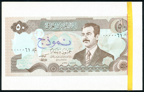Central Bank of Iraq, Republic Issue, specimen 50 dinars in folder, 1994, zero serial numbers, brown, Saddam Hussein at right, reverse brown, bridge(Pick 83s), blue Arabic overprint, uncirculated and rare
