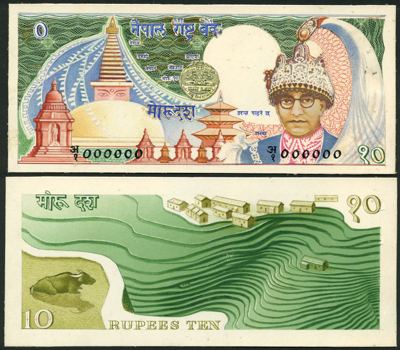 Central Bank of Nepal, an obverse and reverse composite essay for a 10 rupees, ND (ca 1974), multicoloured, King Birendra Bir Bikram wearing plumed crown at right, temples at left, reverse green, rice fields and houses, cow low left