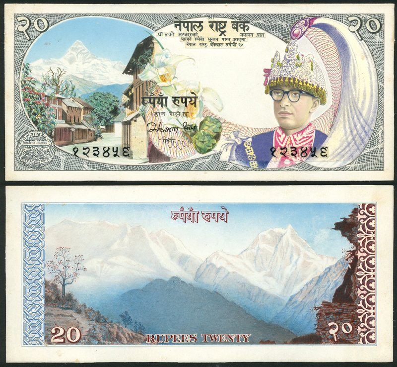 Central Bank of Nepal, an obverse and reverse composite essay for a 20 rupees, ND (ca 1974), multicoloured, King Birendra Bir Bikram wearing plumed crown at right, flower at centre, village and view of Mount Everest at left, reverse brown and pale blue and white, the Himalayas
