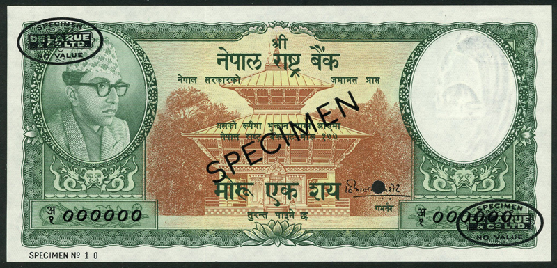 Central Bank of Nepal, specimen 1 mohru, lilac and green, specimen 5 mohru, violet and green and specimen 10 mohru, black and pink, all ND (19600, specimen 100 rupees, green and brown, ND (1961), King Vikrama at left, the temple at Lalitpor at centre