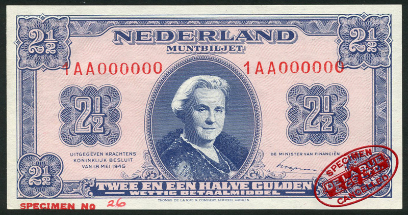 Netherlands Muntbiljet, specimen 1 gulden, 1945, serial number 1AA000000, brown and pale green, also a die proof in black and white for the same issue, also a specimen 2 1/2 gulden, 1945, serial number in red 1AA 000000, pink and blue, all Queen Wilhelmina at centre