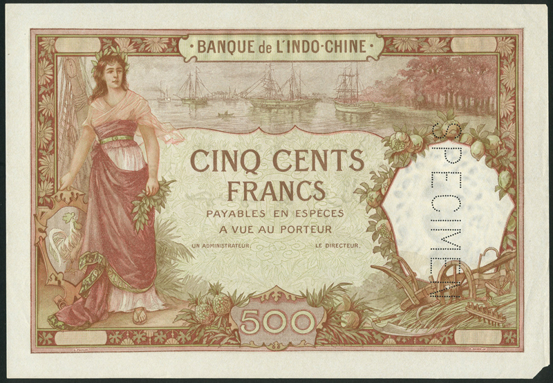 Banque de L´Indochine, Noumea, specimen 500 francs, ND (1927-38), no serial numbers brown, olive and green, woman standing at left, ships at top, agricultural allegories at low right, value at low centre, reverse woman at right