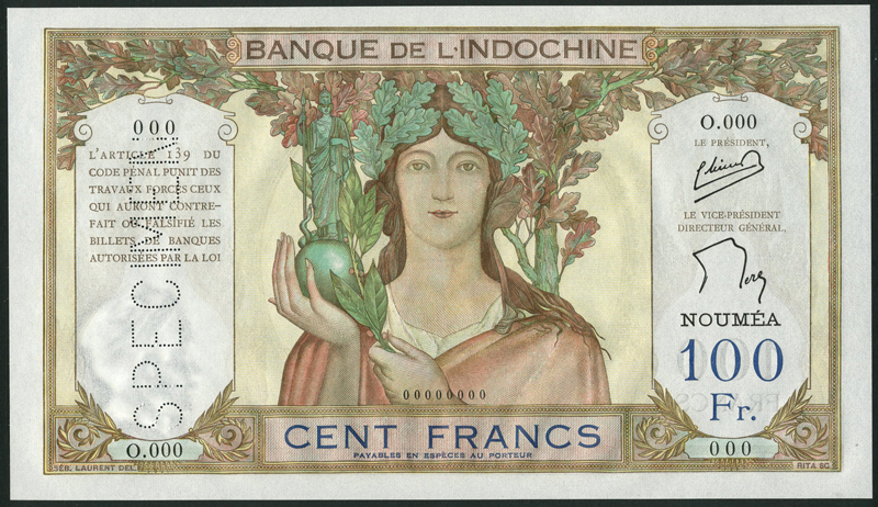 Banque de l´Indochine, Noumea, specimen 100 francs, ND (1957), serial number O.000 000, multicoloured, woman with wreath and small statue of Athena at centre, value at low centre and low right, reverse Angkor statue