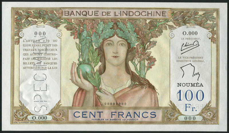 Banque de l´Indochine, Noumea, specimen 100 francs, ND (1957), serial number O.000 000, multicoloured, woman holding wreath and small figure of Athena at centre, reverse Angkor statue at centre
