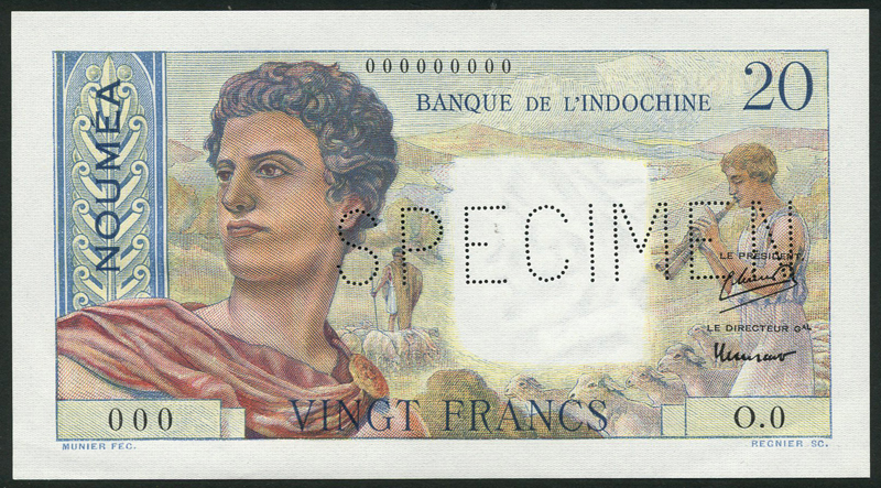 Banque de l´Indochine, Noumea, specimen 20 francs (3), ND (1951), all serial number O.0 000, multicoloured, youth at left, shepherd at centre left, flute player at right, value at top right, reverse woman at centre right, fruit at left