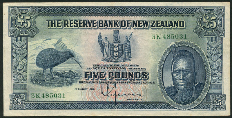 Reserve Bank of New Zealand, £5, 1 August 1934, serial number 3K 485031, blue on multicolour underprint, Maori Chief at right, kiwi bird at left, arms at centre, value at centre and each corner
