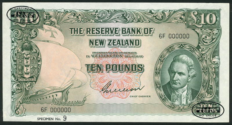 Reserve Bank of New Zealand, specimen 10/-, brown, specimen £1, purple, specimen £5, blue and specimen £10, green, all ND (1955), all zero serial numbers, all Captain Cook at right, arms at centre and all Wilson signature, also a £5, ND (1956), blue, Fleming signature