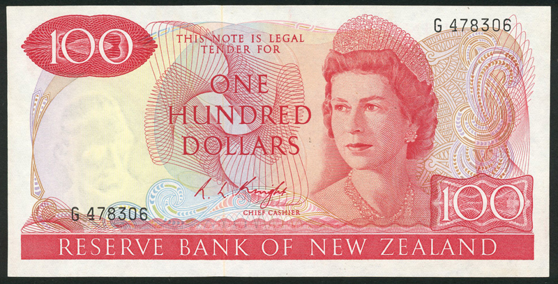 Reserve Bank of New Zealand, $100 (2), ND (1975-1977), red and multicoloured, Elizabeth II at right, Knight signature