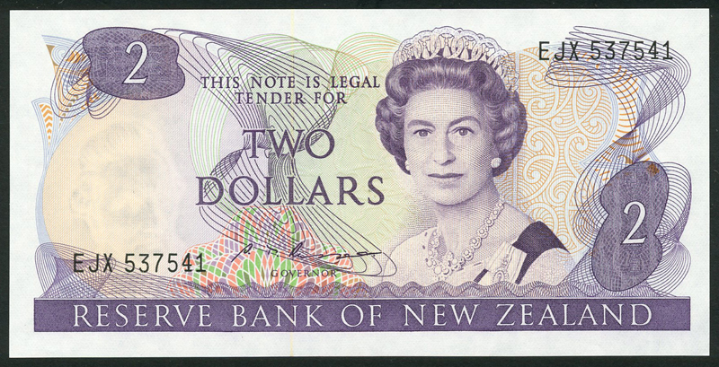 Reserve Bank of New Zealand, $1 (10), serial numbers AHW 231817-231826, brown and multicoloured, Elizabeth II at right, Russell signature, also $2 (10), serial numbers EJX 537826-537541, violet and multicoloured, Elizabeth II at right, Russell signatures, all ND (1985-1989),