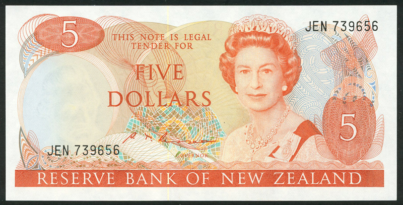 Reserve Bank of New Zealand, $5 (10), ND (1985-1989)serial numbers JEN 739647-739656, orange and multicoloured, Elizabeth II at right, Russell signature,
