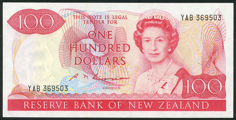 Reserve Bank of New Zealand, $20, ND (1985-1989), serial number TEK 195125, green and multicoloured, and a $100, ND (1985-1989), serial numberYAB 369503, red and multicoloured, both Elizabeth II at right and Russell signature