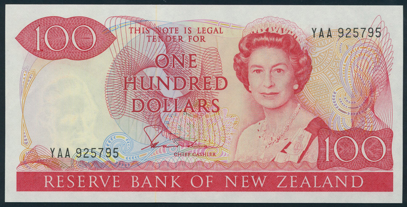 Reserve Bank of New Zealand, $100, ND (1981-1985), serial number YAA 925795, red and multicoloured, Elizabeth II at right, Hardie signature, reverse red and multicoloured, Takahe at centre