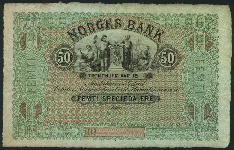 Norges Bank, specimen 50 speciedaler, Trondhjem, 18- (ca 1866), green, blue and lilac, four allegorical figures and arms top centre, value at left and right