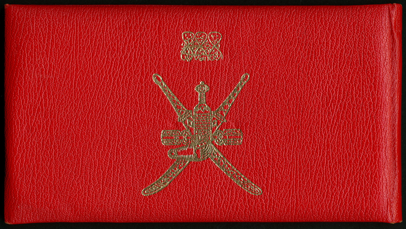 Sultanate of Muscat and Oman, a presentation book in red leather with arms in gold for the 1970 issue, including specimen 100 baiza, brown, 1/4 rial saidi, blue, 1/2 rial, green, 1 rial saidi , red, 5 rials saidi, violet and 10 rials saidi, purple, all zero serial numbers, all arms at right