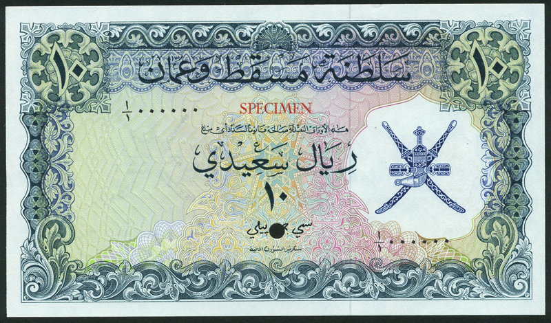 Sultanate of Muscat and Oman, a colour trial set of the ND (1970) series comprising 100 baiza, purple, 1/4 rial, green, 1/2 rial, violet, 1 rial, blue, 5 rials, red and 10 rials, blue-green, all ND 91970), all serial number 1/1 000000, all arms at right