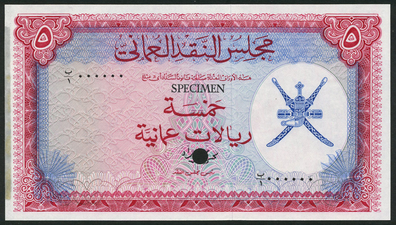 Oman Currency Board, colour trial 5 Rials Omani, ND (1973), zero serial numbers, red on multicolour underprint, arms at right, value at top left and right, reverse red, Nizwa Fort