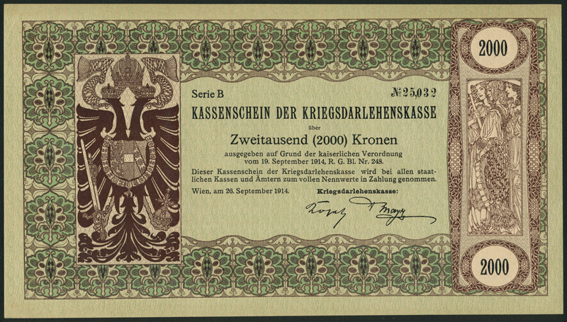 Kriegsdarlehenskasse Kassenschein (War State Loan Bank), 2000 kronen, 26 September 1914, serial number 25032, light and dark green and brown, double headed eagle at left, three allegorical maidens at right, reverse green, text