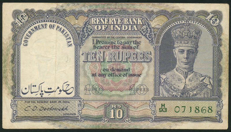 Government of Pakistan, 10 rupees, ND (1948), serial number H/93 071868, purple on green underprint, George VI at right, value at centre, low centre and top left and right, reverse sailing boat