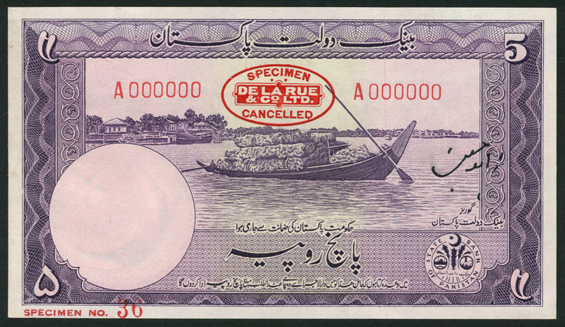 State Bank of Pakistan, specimen 1 rupee, ND (1951), prefix B/10, blue, star and crescent at right, reverse violet, also a specimen 5 rupees, ND (1951), red serial number A 000000, violet and pale green, boat laden with jute at centre, reverse violet, Khyber Pass